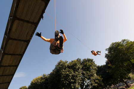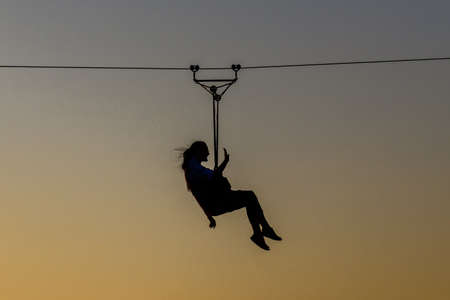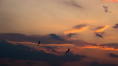 The scenery of the silhouette of the men hanging on the zip line in sunset time.