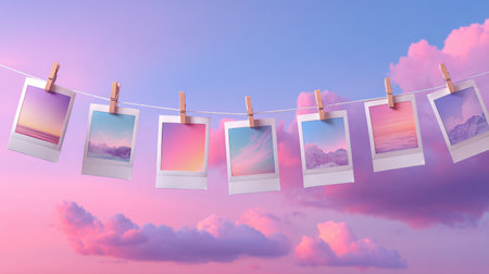 Colorful sunset sky with hanging photographs showcasing beautiful landscapes at dusk