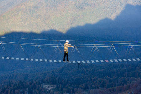 Highliner on the background of blue sky makes a move. A man is walking along a stretched sling view from below. Performance tightrope walker. Man balances over the abyss. A decisive step forward.