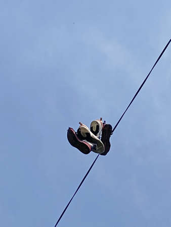 old gym shoes highly hang separately on a cable or a cord against the blue sky