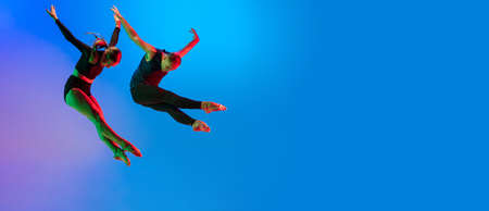 Stylish sportive caucasian couple, male and female dancer dancing contemporary dance on colorful gradient blue pink background in neon light.