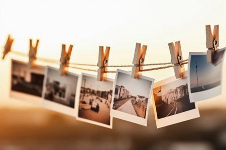 Colorful Polaroid photos are displayed on a string with clothespins, creating a nostalgic atmosphere against a lively evening backdrop.