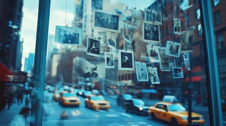 A vibrant urban street scene captures a window displaying nostalgic photographs, framed by bustling city life and yellow cabs creating dynamic visuals.