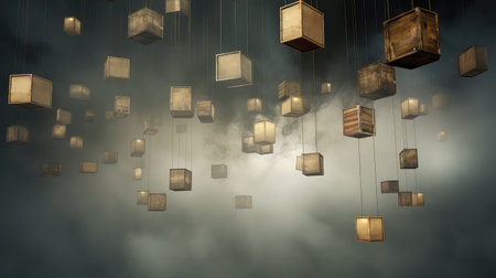 A collection of clear, floating cubes showcase vibrant seasonal and seaside scenery, creating an elegant, surreal display on a neutral gray canvas.