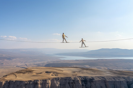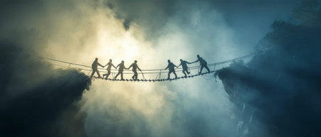 A group of people walks together on a rope bridge, holding hands to support each other as they navigate the foggy canyon, showcasing teamwork and cooperation.