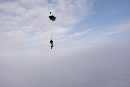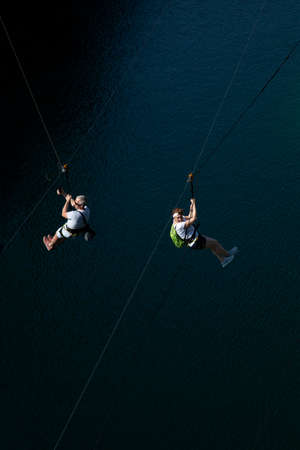 Jumping from the bridge to the rope.Ropejumping.Dangerous hobbies.Brave woman jumping from the bridge against the sky