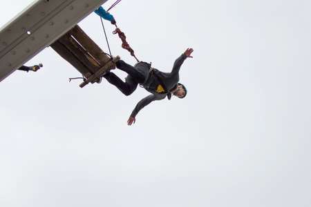 Belarus, Gomel, March 08, 2019. Jumping from the bridge to the rope.Ropejumping.