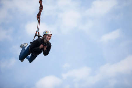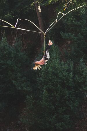 Belarus, Gomel, March 08, 2019. Jumping from the bridge to the rope.Ropejumping.Dangerous hobbies.Brave woman jumping from the bridge against the sky