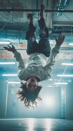 Breakdancer dressed vintage attire, leaping mid-motion against white studio background. Moment frozen in time. Concept of extreme movement, physical artistry, music, energy, passion, performance.