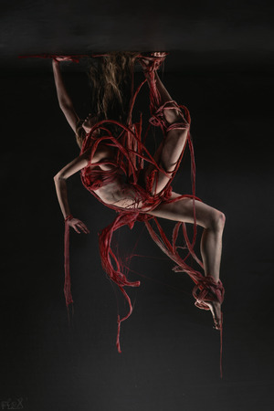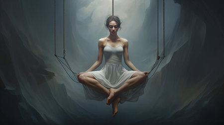 Circus artist on the aerial straps with costume on the black and smoked background. Concept of suffering, despair and defeat