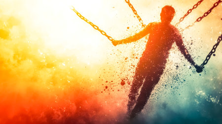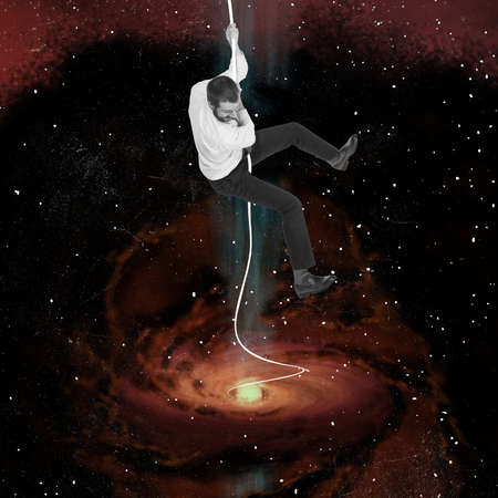 Contemporary art collage, Creative artwork of businessman bangle, fall into nowhere, hole isolated on painting background. Failure. Concept of business, career growth. Copy space for ad.