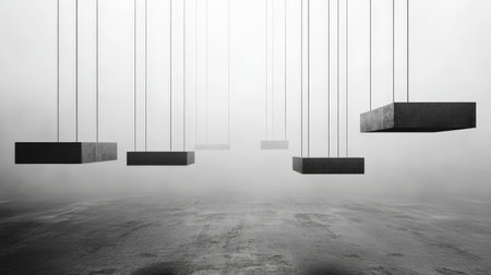 A collection of clear, floating cubes showcase vibrant seasonal and seaside scenery, creating an elegant, surreal display on a neutral gray canvas.