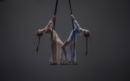 Female gymnastic duo isolated on monochrome studio background. Girls aerial dancers spin on acrobatic trapeze with straps.