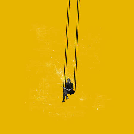 Contemporary art collage. Conceptual image. Young man sitting on swing and reading isolated on yellow background. Loneliness. Concept of emotions, feelings, psychology, depression and despair