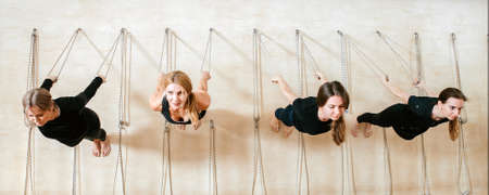 Panorama of lyengar female group of yogi practicing calisthenics exercise in yoga studio hanging on a wall with ropes