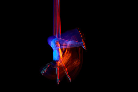 Balance. Young flexible girl doing aerial yoga, training over black studio background in neon with mixed lights. Concept of fitness and healthy lifestyle