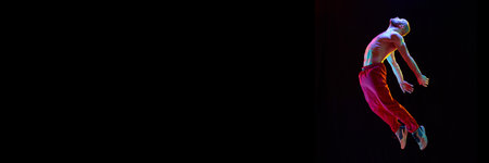 Banner. Junior athlete running, leaping in motion in neon light against gradient studio background with negative space to insert text. Concept of sport, leisure activity, hobby, competition. Ad