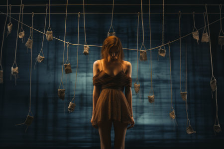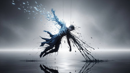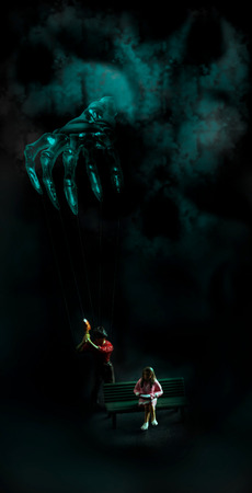 Narrative of control depicted through a puppet on strings held by a detailed hand against a dark background