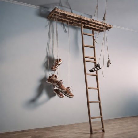 Ljubljana, Slovenia - August 15, 2024: Shoes hanging on wires in the Metelkova area of Ljubljana, a symbol of alternative culture and urban expression