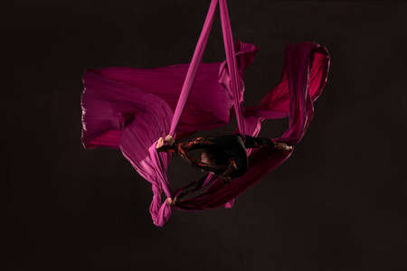 A young girl performs the acrobatic elements in the air trapeze. Studio shooting performances on a black background