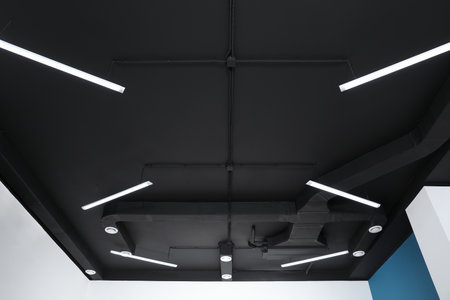 Black ceiling with modern lighting in office
