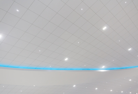 White ceiling with lamps in modern office building. Modern office building.