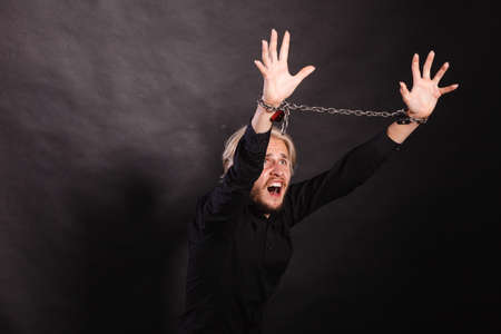 No freedom, social problems concept. Furious man with chained hands, studio shot on dark grunge background
