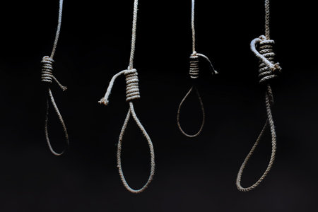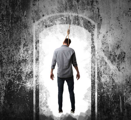 Closeup suicide hanging red rope with blur sad woman looking at it in abandon house. Depression, stress, love heartbreak, death, and misery concept.
