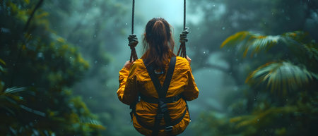 Woman suspended on zipline in lush forest enjoying thrilling experience in nature. Concept Outdoor Photoshoot, Adventure Activities, Nature Thrills, Ziplining Excitement, Forest Adventures