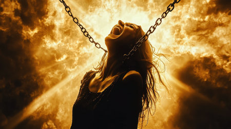 A woman with dark, flowing hair screams in despair, her face illuminated by a powerful light behind her. Chains around her neck symbolize confinement and struggle against overwhelming odds.