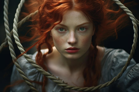 Captivating portrait of a woman with striking red hair, encircled by a twisted rope
