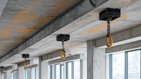 Modern construction zone with precast concrete panels and crane hooks suspended