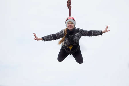Belarus, Gomel, March 08, 2019. Jumping from the bridge to the rope.Ropejumping.An elderly woman jumps from a great height and flies on the rope in the sky. Extreme hobby of the pensioner