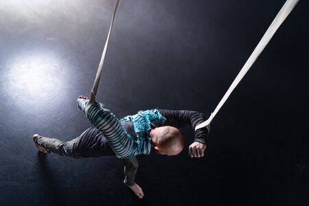 Circus artist on the aerial straps with costume on the black and smoked background.