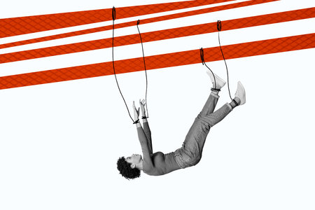 Contemporary artwork banner collage of astonished girl wear handcuffs marionette control ribbon