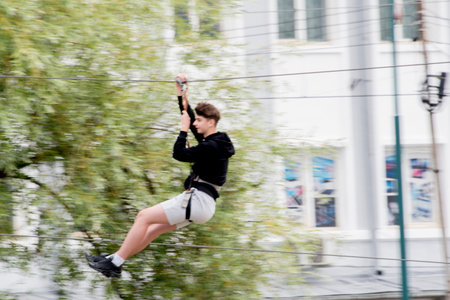 A woman in a rock climbing outfit slides down a steel cable on a roller gurney against the sky. Extreme recreation and sports. Amusement park for brave people. outdoor activities. dangerous hobby