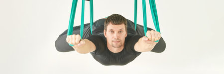 Male person do hammock yoga class exercise. Meditation in air calm. Aero beginner studio workout. Man lifestyle. Guy training zen pose. Green. Hammock stretching at gym. Banner, copyspace