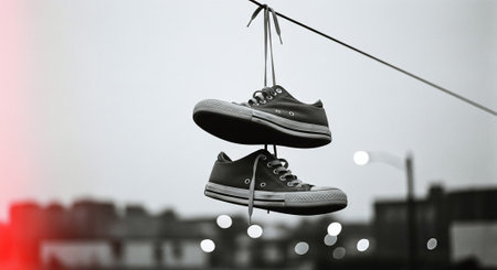 Ljubljana, Slovenia - August 15, 2024: Shoes hanging on wires in the Metelkova area of Ljubljana, a symbol of alternative culture and urban expression