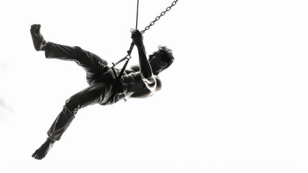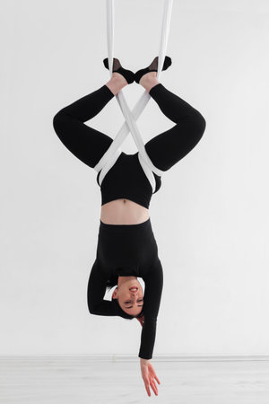 Female in black tights. Professional aerial performer. Inverted anti-gravity Aerial yoga with the use of aerial silks or fabrics, Balance between physical and mental effort concept. Isolated on white.