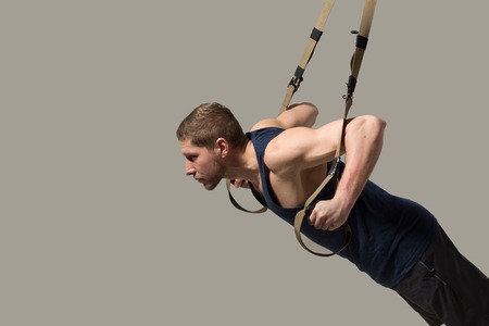 Beautiful young woman training with suspension trainer sling or suspension straps in gym.