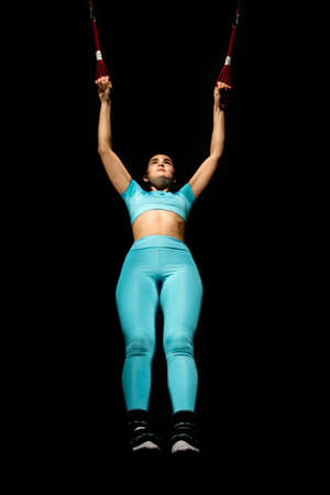 Alfagravity training, a new sport. Young athletic woman in sports clothing training legs with Alfagravity fitness straps in the gym. High quality photo