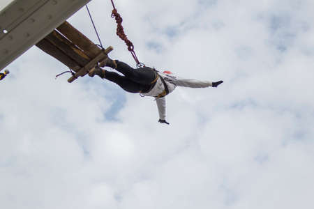 Extreme jump from the bridge. The man jumps surprisingly quickly in bungee jumping at Sky Park explores extreme fun. Bungee in the canyon