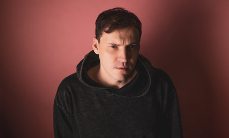 A man stands against a wall with a serious expression. He wears a dark hoodie that covers his neck. The studio lighting creates focus on his face and posture.