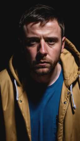 A man with a serious expression gazes directly at the viewer. His face is illuminated by soft light, highlighting his features in a dramatic way. The background is dark, enhancing the focus on him.