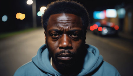 photo of portrait close up view of criminal suspect in crime scene standing in front of police car at night and red blue light, generative AI
