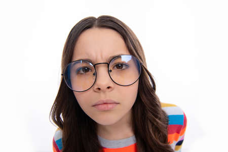 Funny girl face. Little kid girl 12,13, 14 years old in eyeglasses on isolated background. Children studio portrait. Emotional kids face.