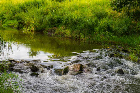 River flow over rocks in summer day. Waves of the river flow. Relaxing nature landscape scenics
