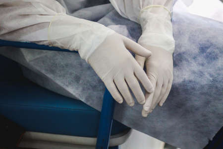 Man takes off his medical gloves. Covid-19 prevention.