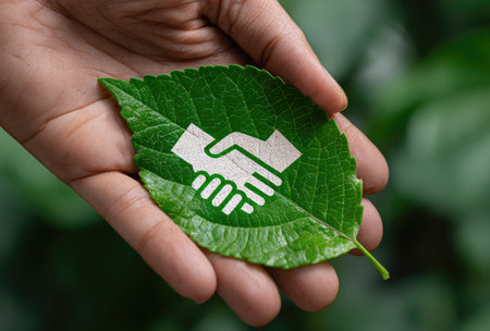 A close-up captures a hand cradling a vibrant green leaf, adorned with a white handshake symbol. The composition highlights contrasting textures and colors, with the leaf's organic form against the human hand. The image suggests ecological cooperation and sustainable practices, appropriate for various commercial and editorial applications.