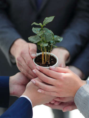 close up.a fragile little sprout in the hands of the business team